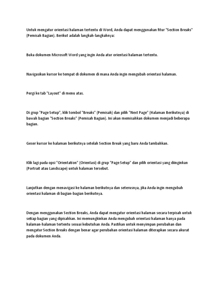 Dengan memahami cara menggunakan opsi "Orientation" langsung dari pita, dan dengan menguasai penggunaan "Section Breaks" untuk mengelola orientasi yang berbeda dalam satu dokumen, Anda akan dapat menyusun dokumen yang tidak hanya informatif tetapi juga menarik secara visual dan mudah dinavigasi. Ingatlah untuk selalu meninjau hasil akhir Anda, melakukan penyesuaian yang diperlukan, dan menggunakan fitur "Print Preview" atau menyimpan ke PDF untuk memastikan presentasi yang sempurna. Selamat menyusun dokumen Anda dengan presisi dan gaya!